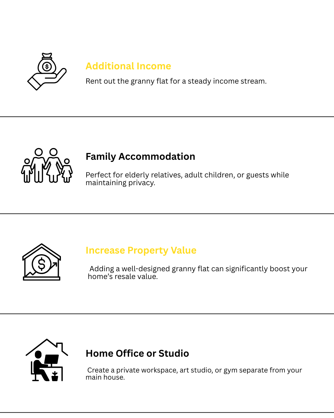 Yes. Granny flats are ideal for elderly family members, adult children, or rental income through platforms like Airbnb.