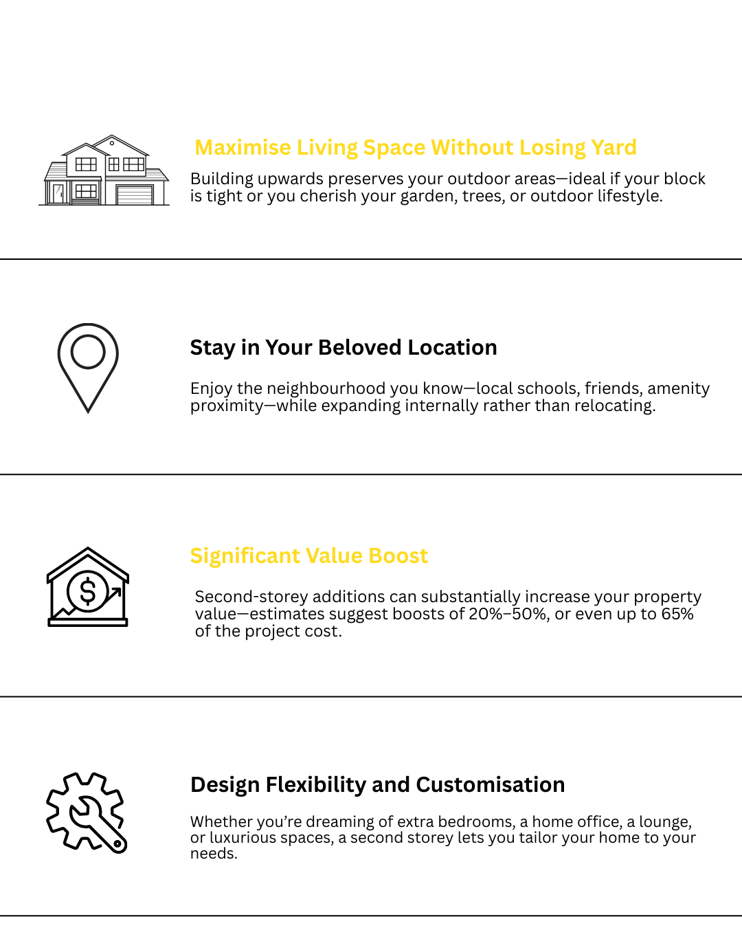 Often yes. A professionally built second storey that adds bedrooms, bathrooms, or living space can significantly boost property value, especially in land-constrained suburbs.